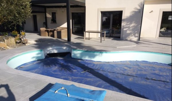 Pose de carrelage effet pierre sur la terrasse avec piscine d'une maison à Saint-Nazaire